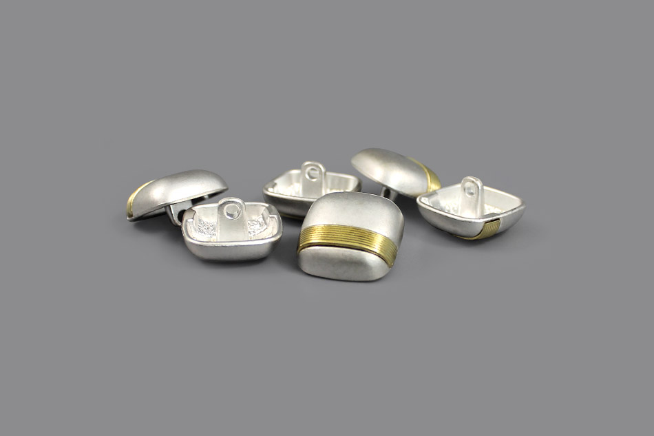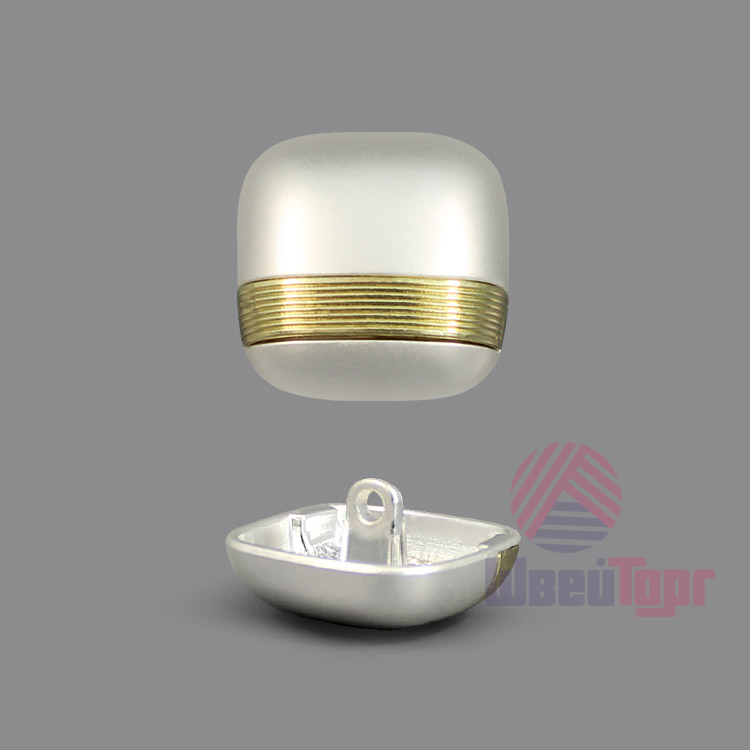Эта пуговица на ножке выполненная в сдержанном современном стиле станет идеальным акцентом для делового гардероба. Она представляет собой лаконичный «мягкий» квадрат из металла с деликатно скруглёнными углами, имеет матовое серебристое покрытие. Её лаконичный дизайн оживляет тонкая золотистая полоска с фактурной поверхностью, проходящая по нижнему краю.