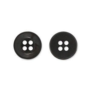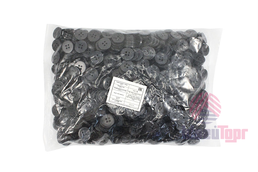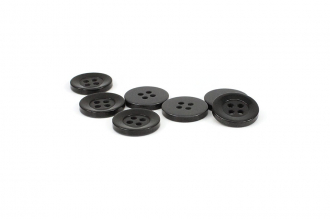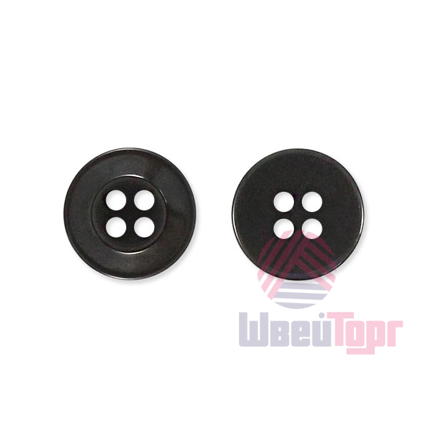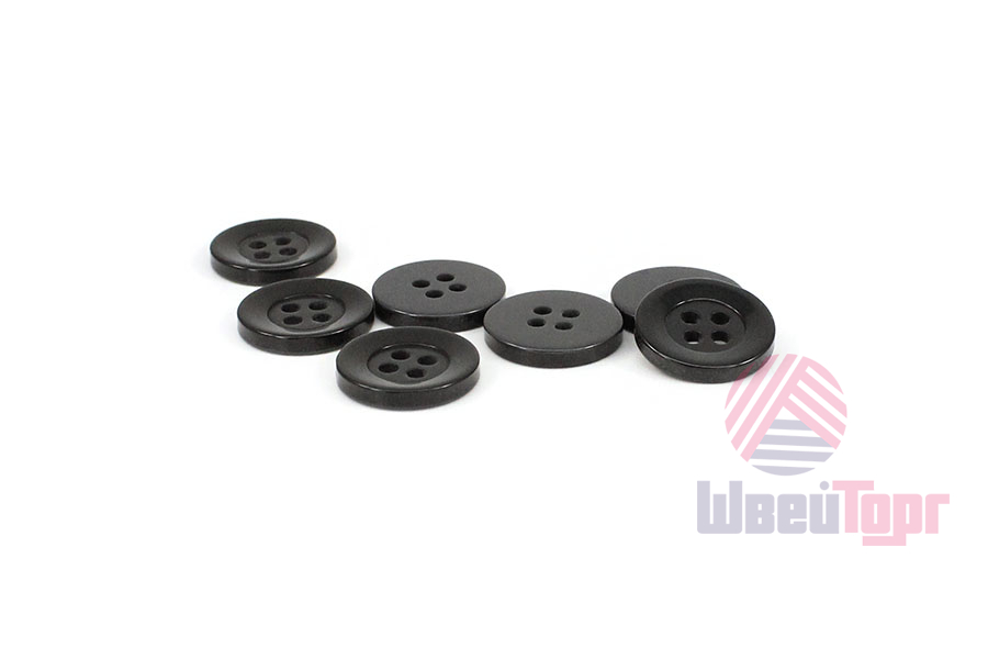 Пластиковые брючные пуговицы на четыре прокола. Лицевую сторону пуговиц окаймляет плоское кольцо шириной 3 мм и небольшое углубление, что придаёт им особый характер. У пуговиц тёмно-серый цвет, с лёгким мерцанием, что придаёт им ещё более привлекательный вид.