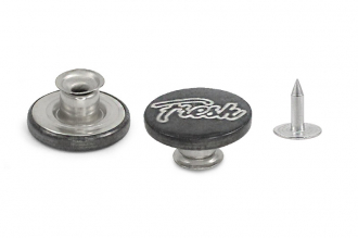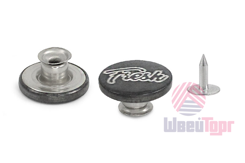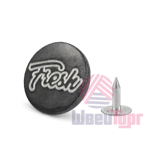 Стильная металлическая пуговица представлена в чернённом цвете. Пуговица имеет плоскую форму и гравировку в виде надписи "Fresh". Эта пуговица станет стильным завершающим штрихом для ваших изделий из джинсы, будь то джинсы, джинсовые шорты или джинсовые куртки. В комплект входят надёжные гвоздики для крепления.