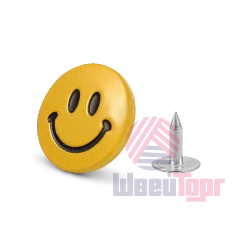 Стильная металлическая пуговица. Пуговица имеет плоскую форму и яркий декор в виде улыбающегося смайла. Эта пуговица станет стильным завершающим штрихом для ваших изделий из джинсы, будь то джинсы, джинсовые шорты или джинсовые куртки. В комплект входят надёжные гвоздики для крепления.
