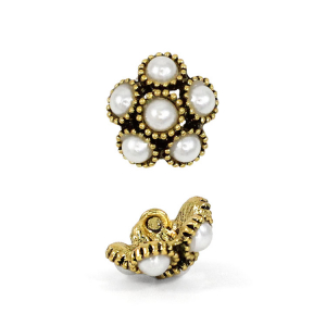 Эта металлическая пуговица на ножке станет изысканным акцентом для вашей одежды. У пуговицы оригинальный дизайн в виде цветка, где роль лепестков и сердцевины играют переливающиеся перламутровые бусины, смотрится необычно и утончённо. Качественная металлическая основа гарантирует прочность и долговечность, делая эту пуговицу идеальным выбором для жакетов и костюмов.