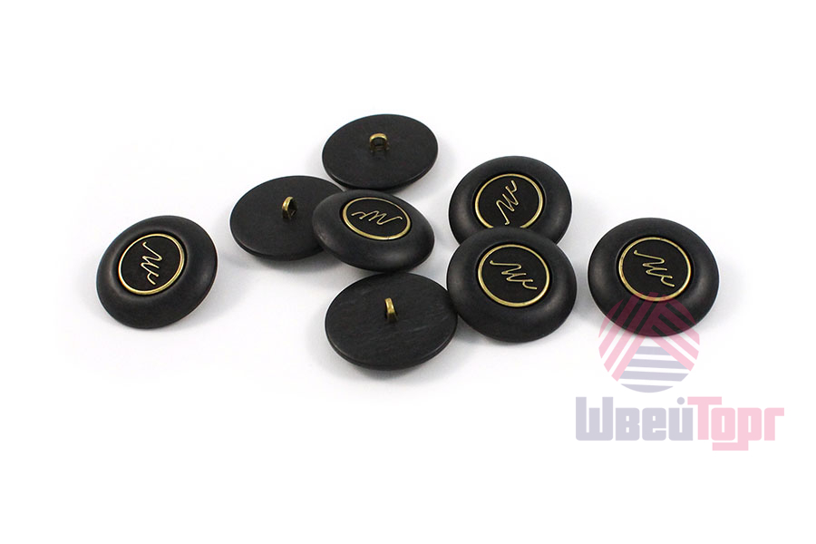 Пластиковая пуговица на ножке для создания стильного образа. Пуговица собрана из двух частей –  матовая, с эффектом разводов основа и бронзовый накладной элемент, в виде стилизованной надписи. Сдержанный и интересный элемент для оригинального образа. Пуговица предсталена в двух расцветках: молочный и чёрный.