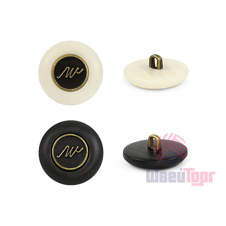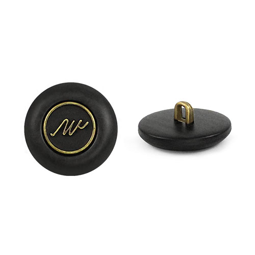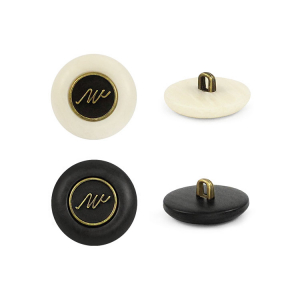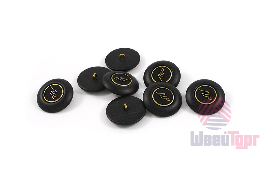 Пластиковая пуговица на ножке для создания стильного образа. Пуговица собрана из двух частей –  матовая, с эффектом разводов основа и бронзовый накладной элемент, в виде стилизованной надписи. Сдержанный и интересный элемент для оригинального образа. Пуговица предсталена в двух расцветках: молочный и чёрный.