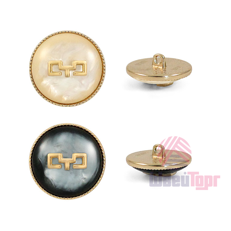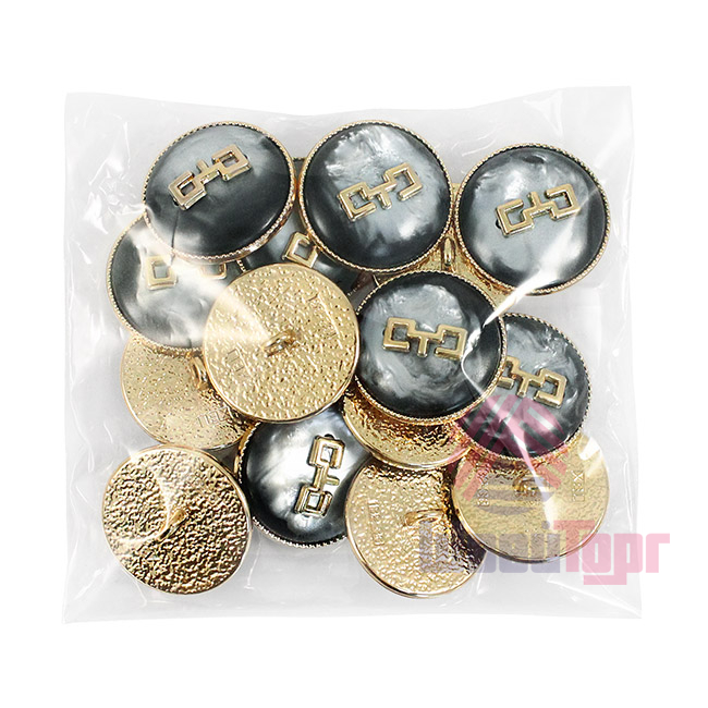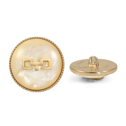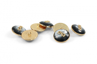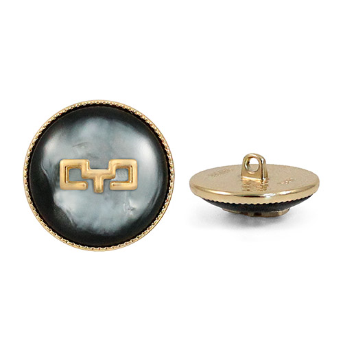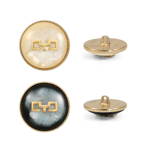 Пуговица собрана из двух частей – золотистая металлическая основа и лицевая часть, с эффектными разводами. С лицевой стороны пуговицу украшает накладной геометрический элемент. Пуговица прекрасно подойдёт для создания оригинального и яркого образа.