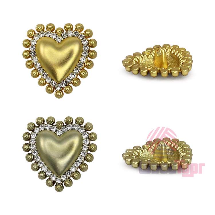 Металлическая пуговица на ножке станет изысканным акцентом вашего наряда благодаря оригинальной форме выпуклого сердечка, украшенного двумя уровнями декора: внутреннее обрамление из сияющих страз и внешний контур из филигранных металлических «бусин». Эта сверкающая деталь идеально дополнит вечерний костюм, жакет или платье, создавая праздничный образ, а выбор между оттенками яркого и тёмного матового золота позволит подобрать идеальное сочетание для любой ткани.
