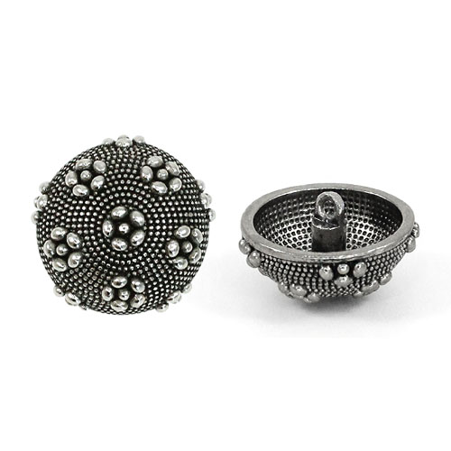 Металлическая пуговица на ножке, диаметр 18 мм, выпуклая форма. У пуговицы оригинальная форма и дизайн - фактурная поверхность, украшенная стилизованными цветками из шариков.