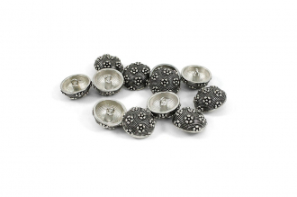 Пуговица доступна в двух цветах – чернённый и антик – оба варианта выгодно подчёркивают рельефную поверхность и добавляют пуговице нотку роскоши. Прочная ножка обеспечивает удобное пришивание, а необычный дизайн делает эту пуговицу настоящим акцентом в любом образе. Данные пуговицы прекрасно подойдут для ваших костюмов и жакетов.