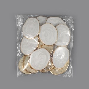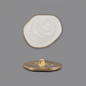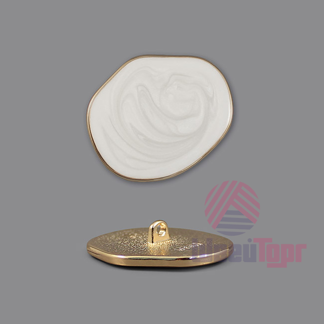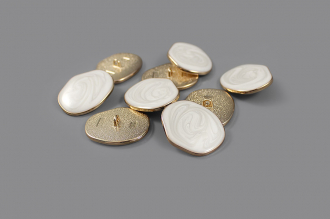 Эти металлические пуговицы на ножке сочетают в себе прочную основу и лицевую вставку из акрила, окаймлённую тонким металлическим ободком. У пуговиц уникальная, плавная асимметричная форма, которая придаёт минималистичному дизайну оригинальный и стильный характер. Перламутровые разводы с мерцающими блёстками создают изысканную игру света.