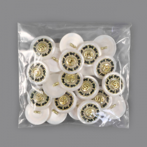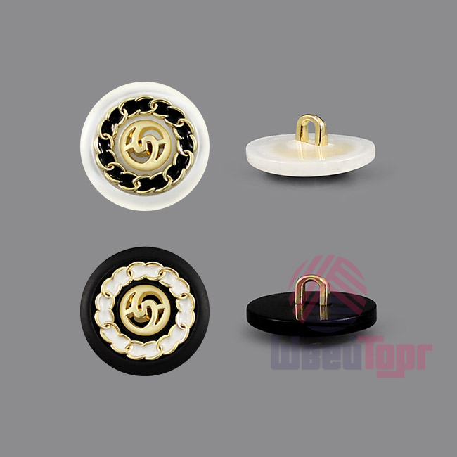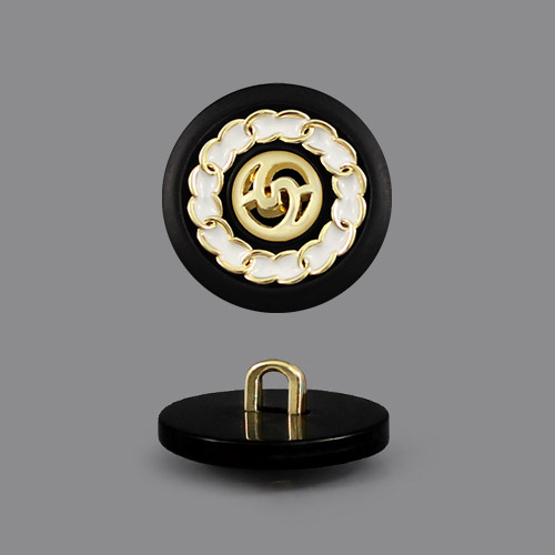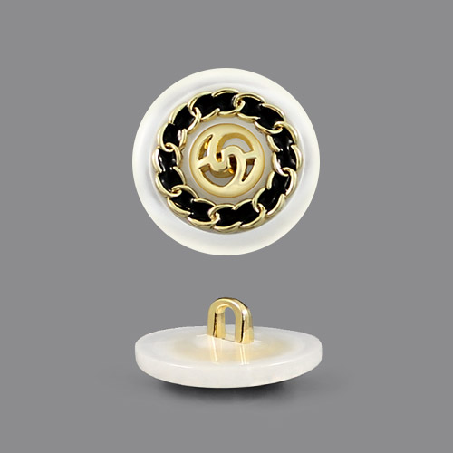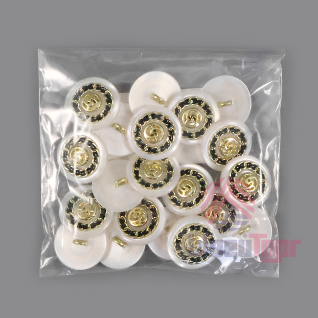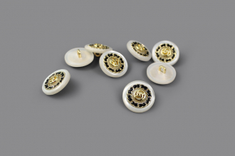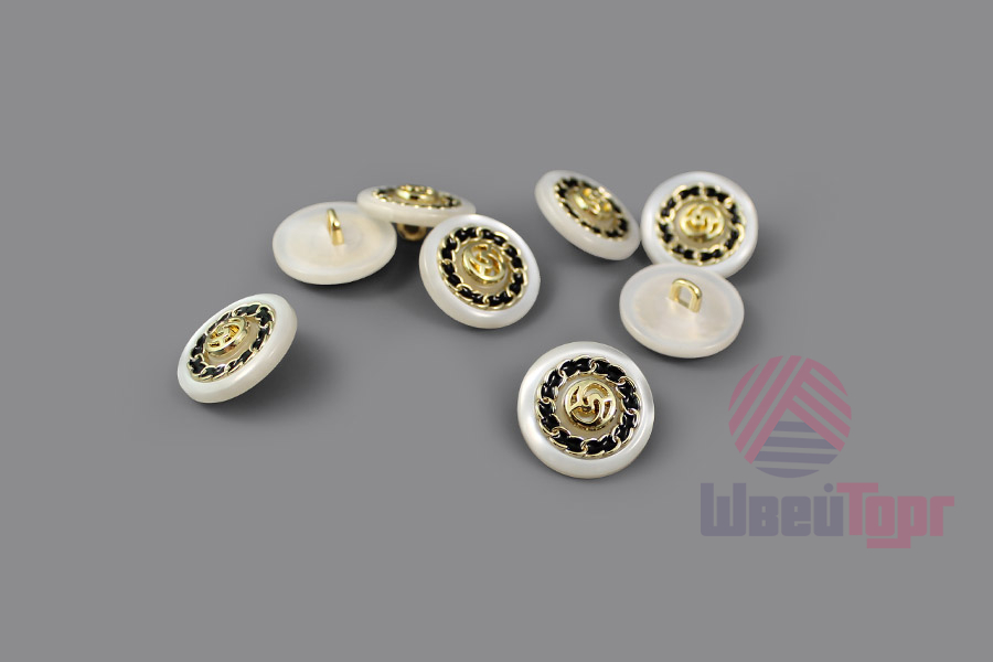 Пластиковая круглая пуговица, выполненная на ножке-петле для удобного и надёжного пришивания. В центре пуговицы расположена объёмная золотистая вставка которую обрамляет имитация цепи. Пуговица доступна в двух вариантах цвета: белый/золото и чёрный/золото.