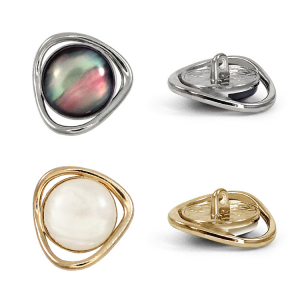 Эта пуговица напоминает миниатюрное произведение искусства. Её основа – стильный асимметричный обод, в центре которого, словно драгоценный камень, сияет выпуклая глянцевая вставка. Пуговица притягивает взгляд своей безупречной чистотой линий и лаконичностью. Представлена в двух вариантах: меланж/серебро и белый/золото.