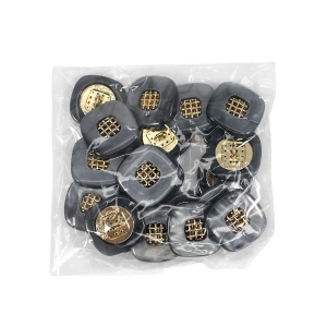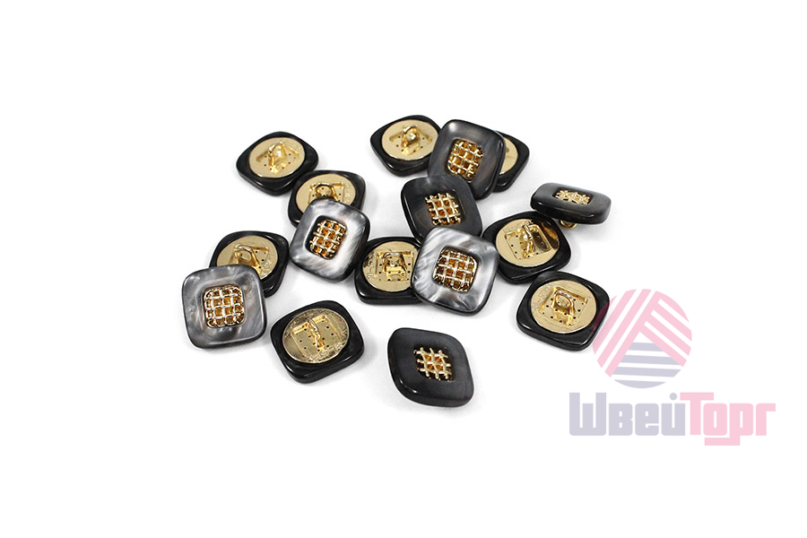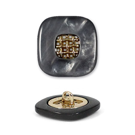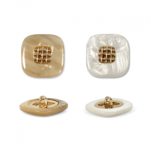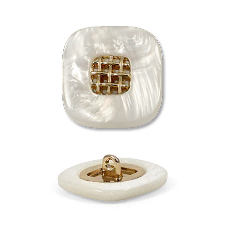 Эта пуговица из пластика с лёгким перламутровым эффектом привлечёт внимание изящной деталью: в центре квадрата, с мягко скруглёнными углами, расположена изысканная золотая решётчатая вставка.