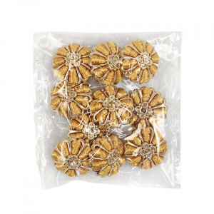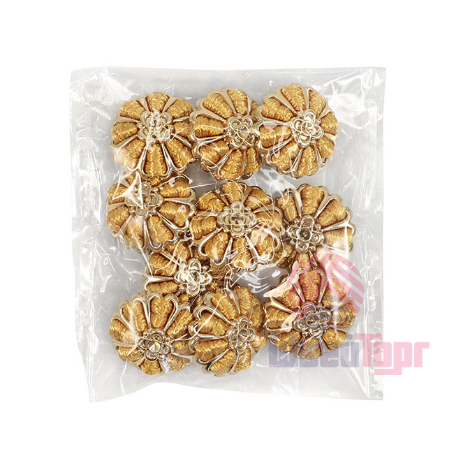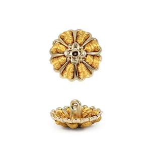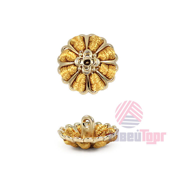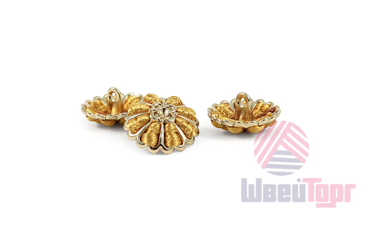 Элегантная пуговица круглой формы станет изысканным акцентом вашего изделия. У пуговицы оригинальная форма в виде цветка, с акцентной центральной частью, обрамлённой лентой, которая эффектно пронизывает металлический "каркас". Диаметр пуговицы: 1,9 см.