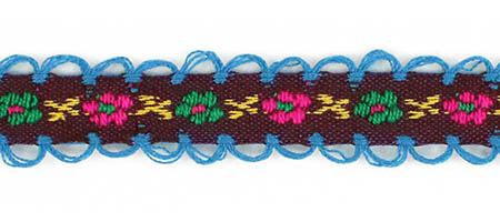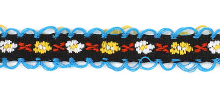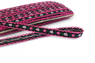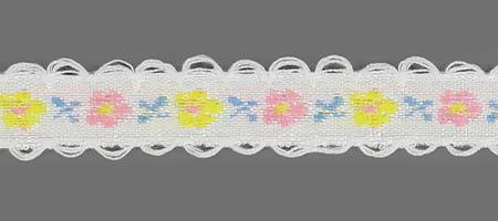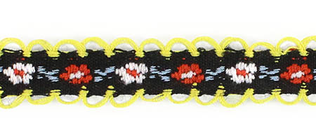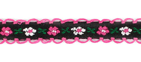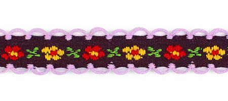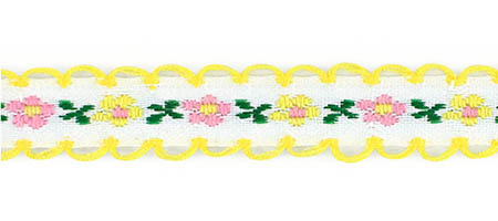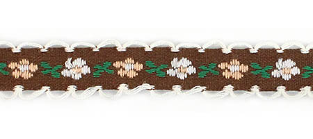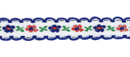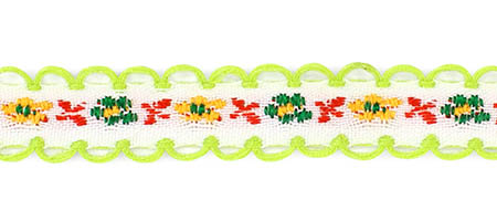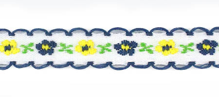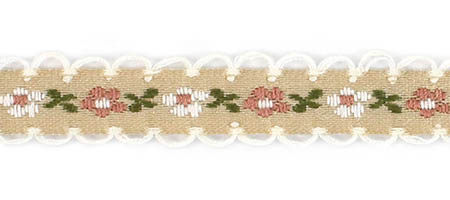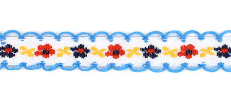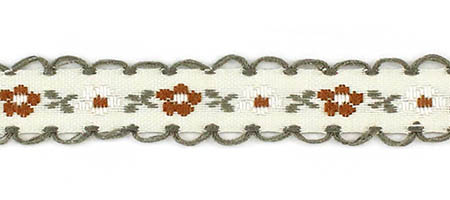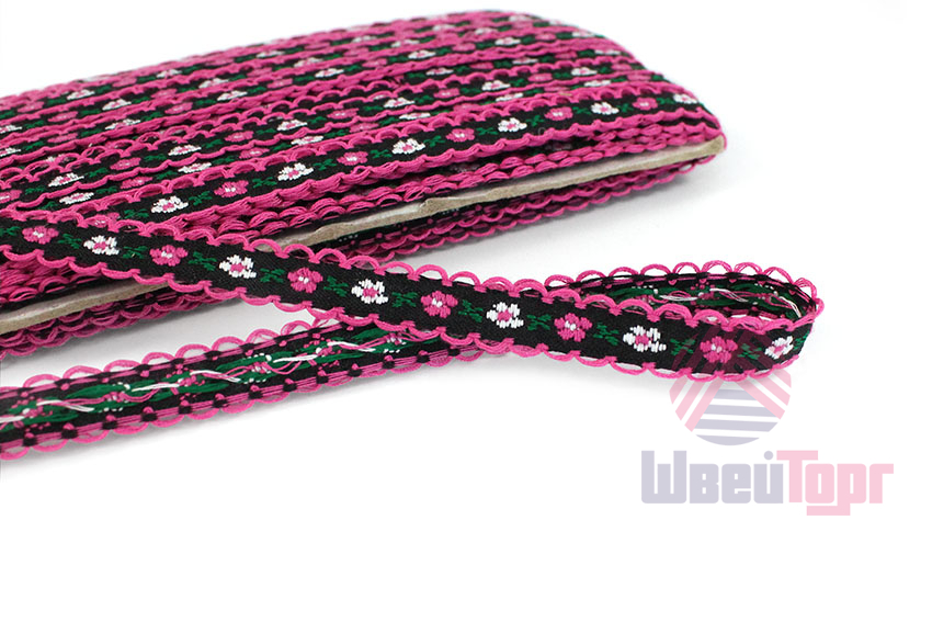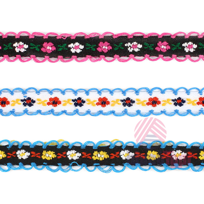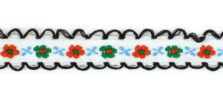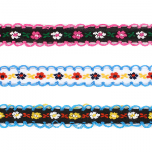 Декоративная тесьма шириной 1 см, украшена милой вышивкой с мелким повторяющимся цветочным узором и ненавязчивыми фестонами по краям.