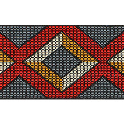 Данная жаккардовая тесьма обладает высокой прочностью, устойчива к растяжению и истиранию. Так как рисунок формируется непосредственно в процессе плетения, что придаёт тесьме эффект вышивки, тесьма сохраняет яркость цветов и не теряет своего внешнего вида долгое время. Рельефный узор тесьмы представляет собой геометрический орнамент. Благодаря высококачественному полиэстеру, из которого она изготовлена, тесьма сохраняет насыщенность цветов даже при частом использовании.