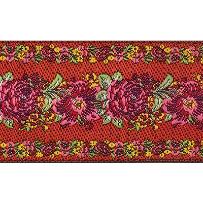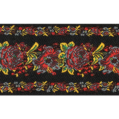 Данная жаккардовая тесьма обладает высокой прочностью, устойчива к растяжению и истиранию. Так как рисунок формируется непосредственно в процессе плетения, что придаёт тесьме эффект вышивки, тесьма сохраняет яркость цветов и не теряет своего внешнего вида долгое время. Рельефный узор тесьмы представляет собой растительный орнамент. Благодаря высококачественному полиэстеру, из которого она изготовлена, тесьма сохраняет насыщенность цветов даже при частом использовании.