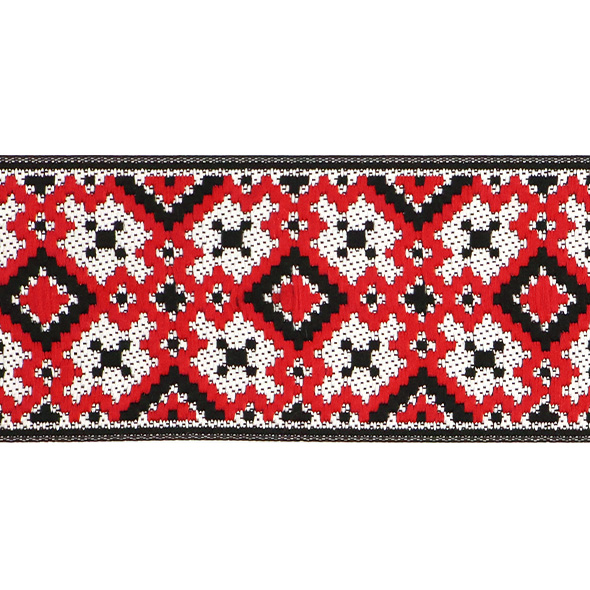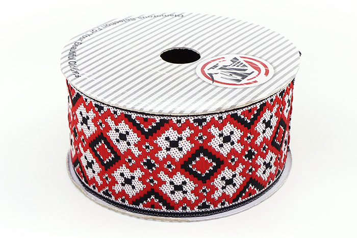 Данная жаккардовая тесьма обладает высокой прочностью, устойчива к растяжению и истиранию. Так как рисунок формируется непосредственно в процессе плетения, что придаёт тесьме эффект вышивки, тесьма сохраняет яркость цветов и не теряет своего внешнего вида долгое время. Рельефный узор тесьмы представляет собой геометрический орнамент. Благодаря высококачественному полиэстеру, из которого она изготовлена, тесьма сохраняет насыщенность цветов даже при частом использовании.