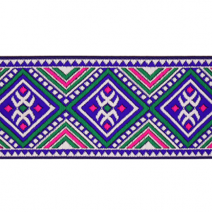 Данная жаккардовая тесьма обладает высокой прочностью, устойчива к растяжению и истиранию. Так как рисунок формируется непосредственно в процессе плетения, что придаёт тесьме эффект вышивки, тесьма сохраняет яркость цветов и не теряет своего внешнего вида долгое время. Рельефный узор тесьмы представляет собой геометрический орнамент. Благодаря высококачественному полиэстеру, из которого она изготовлена, тесьма сохраняет насыщенность цветов даже при частом использовании.