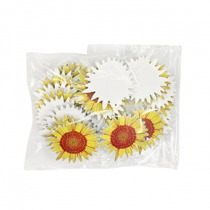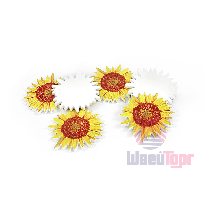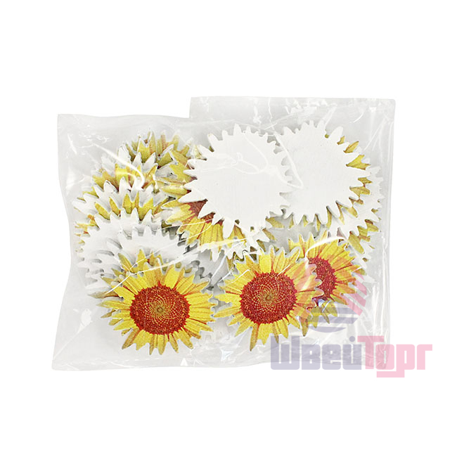 Натуральное деревянное украшение в форме подсолнуха. Лицевая сторона ярко окрашена детализированным рисунком, обратная – покрыта белым цветом. Диаметр украшения: 30 мм.