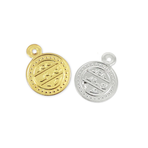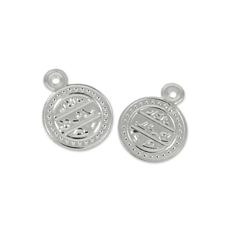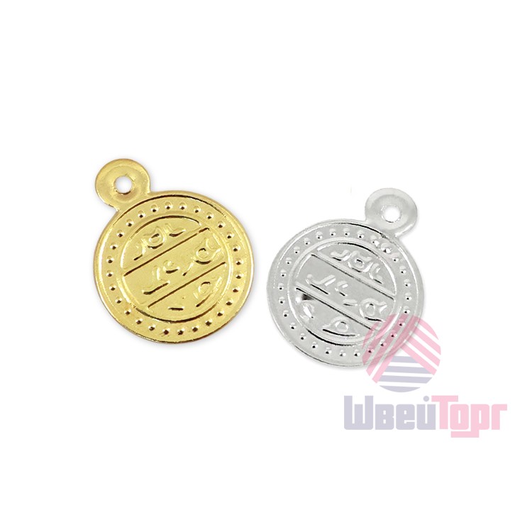 Изделие украшено тиснёным рисунком в восточном стиле, где основным акцентом выступает изящная надпись, обрамлённая орнаментом из объёмных точек. Такая лёгкая фактурность придаёт монеткам выразительность и глубину: при свете софитов или дневном освещении рельефный узор создаёт игру бликов, усиливая сценический эффект. Тонкий металл и продуманный дизайн делают эти монетки не просто функциональной деталью костюма, но и самостоятельным акцентом, который подчёркивает восточную эстетику образа. Представлены в цветах золота и серебра.