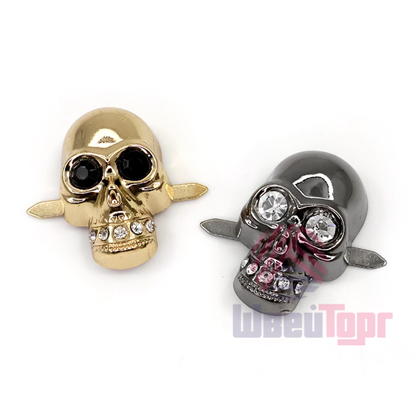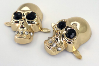 Особую выразительность украшению придаёт инкрустация стразами: глаза и зубы черепа аккуратно выложены блестящими вставками, которые создают контраст между «мрачной» формой и праздничным сиянием. Размер черепа составляет 3,2×2 см, что делает его заметным акцентом, но при этом не перегружает изделие. Такое украшение особенно эффектно смотрится на текстурных плотных материалах — коже, дениме, грубом хлопке — и органично вписывается в стиль гранж или готика. Оно прекрасно подойдёт для декора молодёжных и подростковых аксессуаров: джинсовок, рюкзаков, сумок, а также для придания индивидуальности повседневной одежде, добавляя ей дерзости и характера.