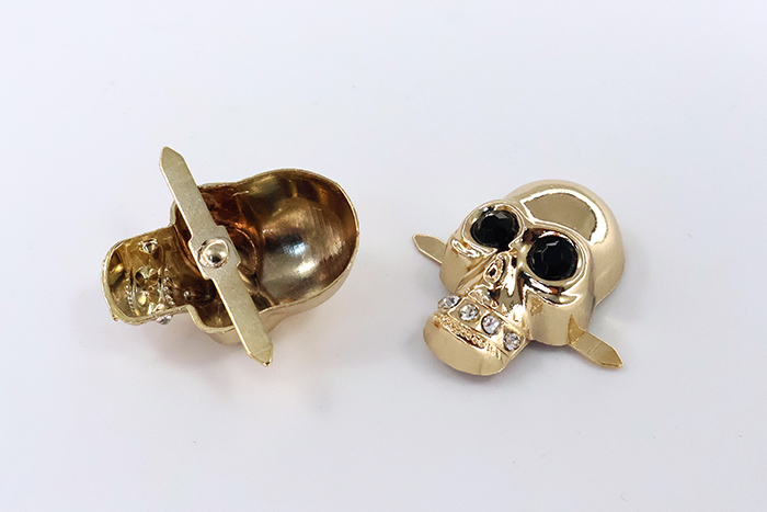 Зажимное металлическое украшение в форме черепа представляет собой необычный аксессуар, который крепится к ткани без шитья и клея. С обратной стороны расположены две небольшие зажимные «лапки»: они вставляются в материал и плотно смыкаются, обеспечивая надёжную фиксацию. Такая конструкция позволяет украшению прочно держаться на любых тканях, за исключением самых тонких и скользящих, вроде шёлка или шифона. При этом сам череп выполнен из тонкого металла и остаётся очень лёгким — несмотря на визуальную массивность, он не утяжеляет ткань и не стягивает её, что особенно важно для одежды и сумок.